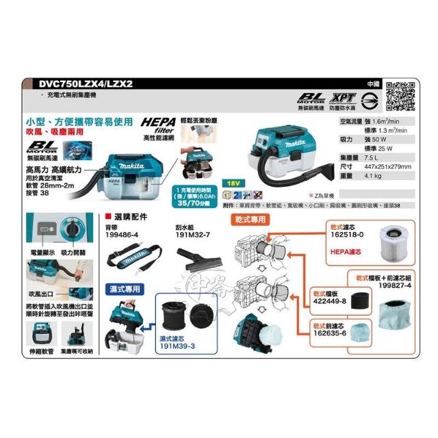 MAKITA 牧田*中崙五金【附發票】牧田 18V 無刷乾溼兩用吸塵器 DVC750LZX4 附背帶 非DVC750LZX2 DVC750