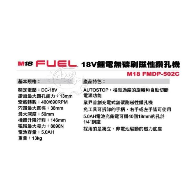 Milwaukee 美沃奇18V鋰電無刷磁性鑽孔機 M18FMDP 單機+選項 M18 FMDP-502C 中崙五金
