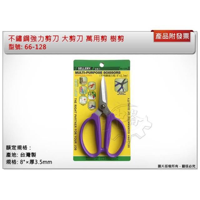 不鏽鋼強力剪刀 大剪刀 萬用剪 樹剪 下方缺口可剪鐵絲 8×厚3.5mm 台灣製66-128 中崙五金