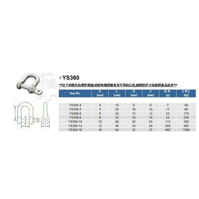 台灣製 D型下古 材質:SUS304不銹鋼 型號:YS360白鐵D型卸克 連接鏈條吊鉤(10mm) 中崙五金