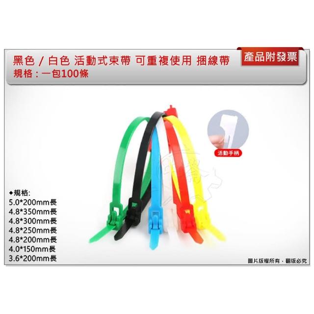 活動式束帶 一包100條 可重複使用 可退式尼龍紮線帶 捆線帶(4.8*200mm長) 中崙五金