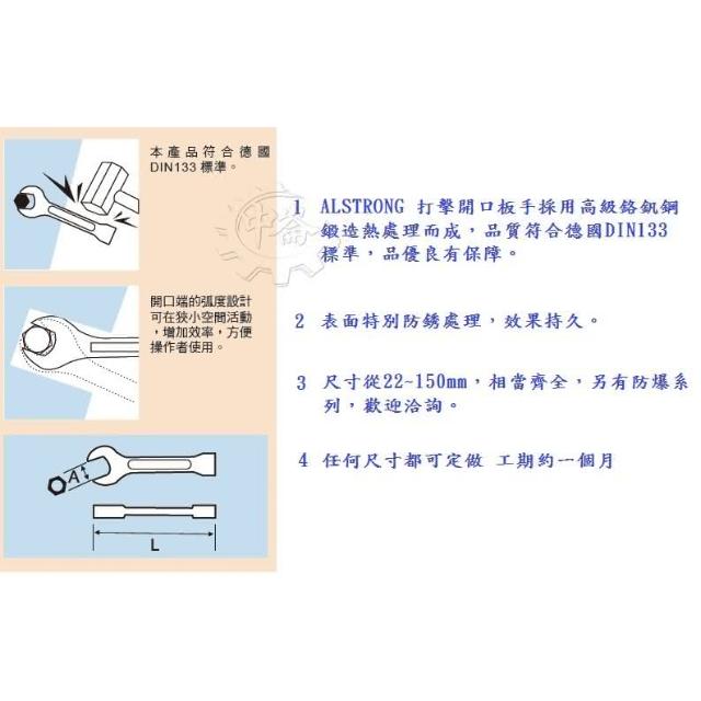 ALSTRONG台灣製 打擊開口板手 高級鉻釩鋼製造 符合德國DIN133標準30mm 中崙五金