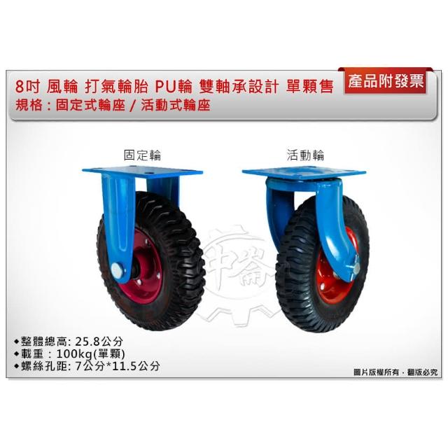 專業 8吋 風輪 打氣輪胎 活動式輪座 PU輪 手推車輪 獨輪車輪 雙軸承設計 中崙五金