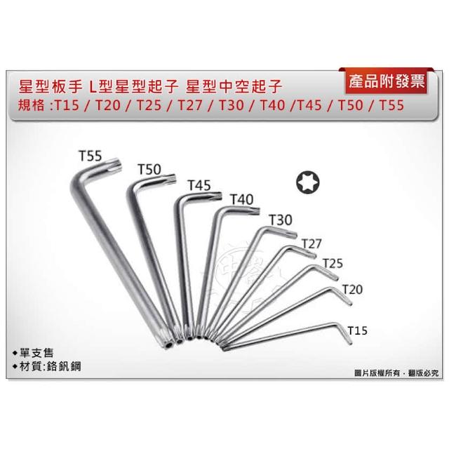 T15/T20/T25/T27/T30/T40/T45/T50/T55 星型L型中空板手 起子 單售 中崙五金