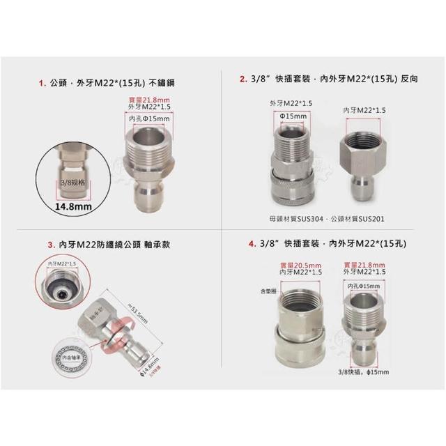 洗車機 出水快速接頭 四種規格 單售 防纏繞銅接頭 旋轉接頭 快速插取 (3/8吋快插 內外牙M22反向) 中崙五金