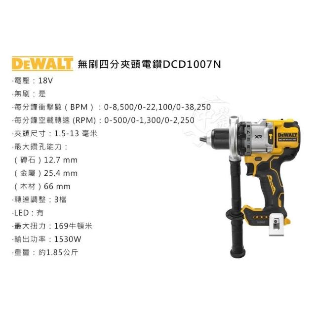 DEWALT 得偉18V XR 無刷四分夾頭電鑽 DCD1007N (單機) 不含電池+充座 電動螺絲起子機 電鑽起子機 中崙五金