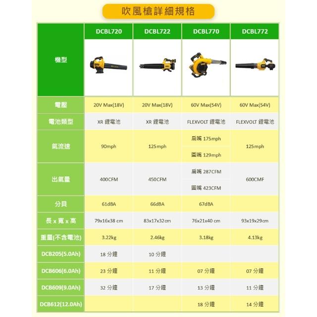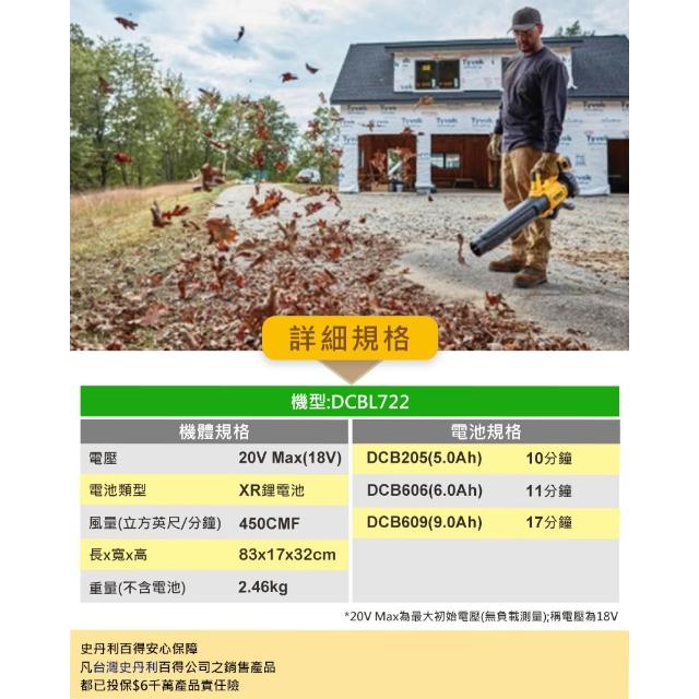 DEWALT 得偉20V無碳刷超強力吹葉機 DCBL722P1吹風機 單電5.0Ah 中崙五金