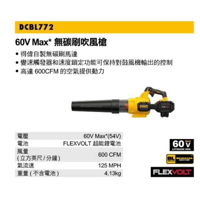 DEWALT 得偉60V Max 無刷渦流吹風機 DCBL772X1 單電池 3.0Ah(同20V 9.0Ah) 中崙五金