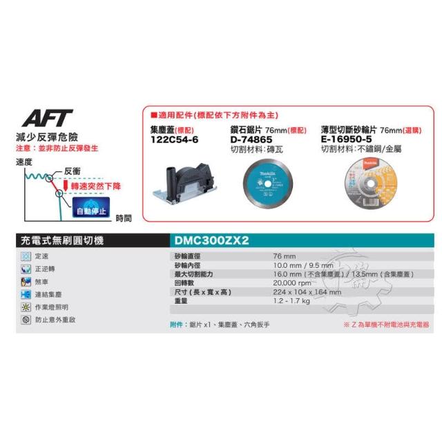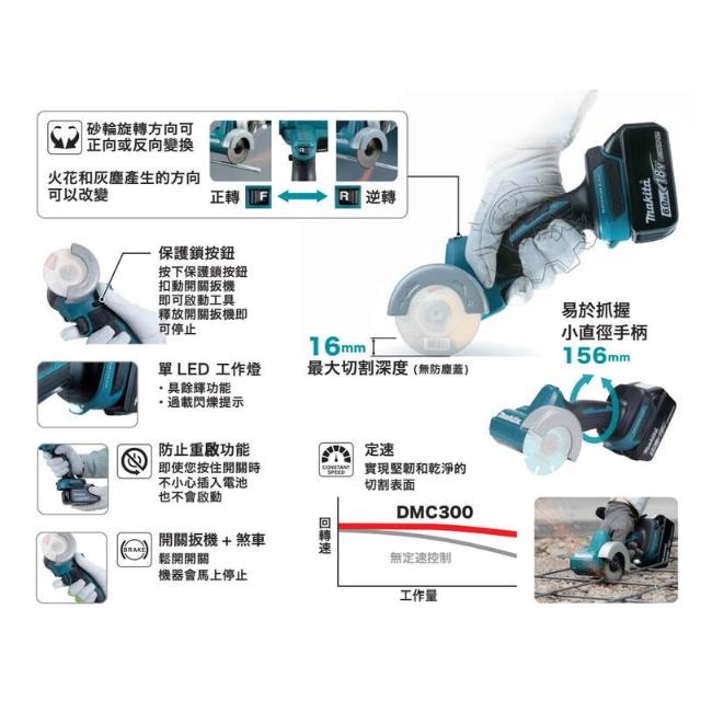 MAKITA 牧田18V 3吋無刷砂輪機 DMC300ZX2 (單主機+選項) DMC300 手持砂輪機 中崙五金