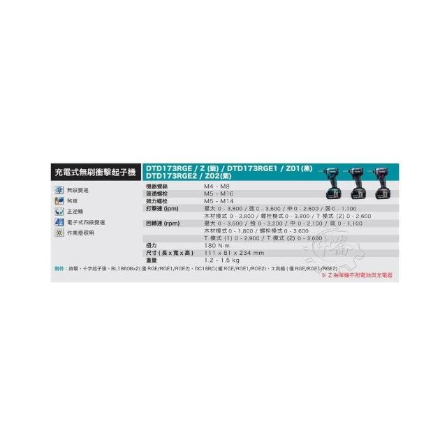 MAKITA 牧田(日本/中國) 18V無刷衝擊起子機 DTD173Z(色) DTD173RGE DTD173 電動螺絲起子機 中崙五金