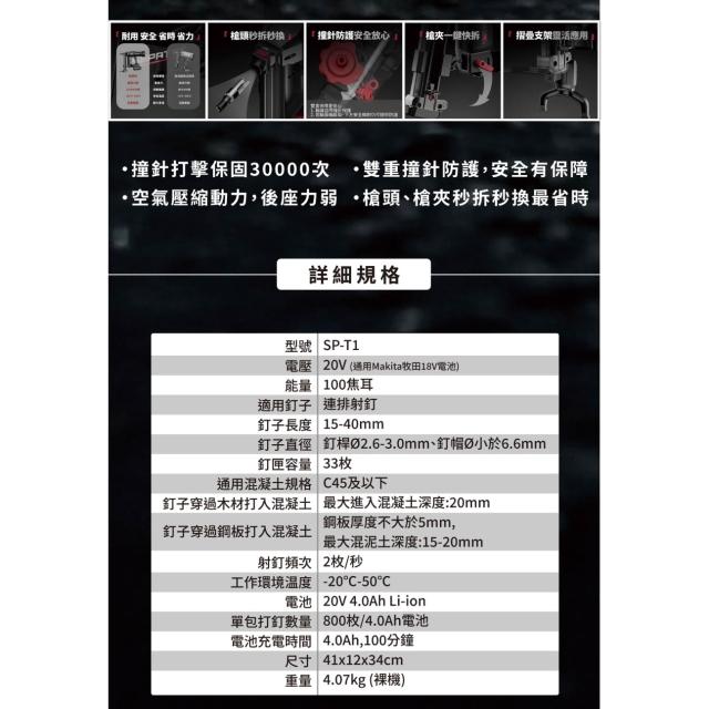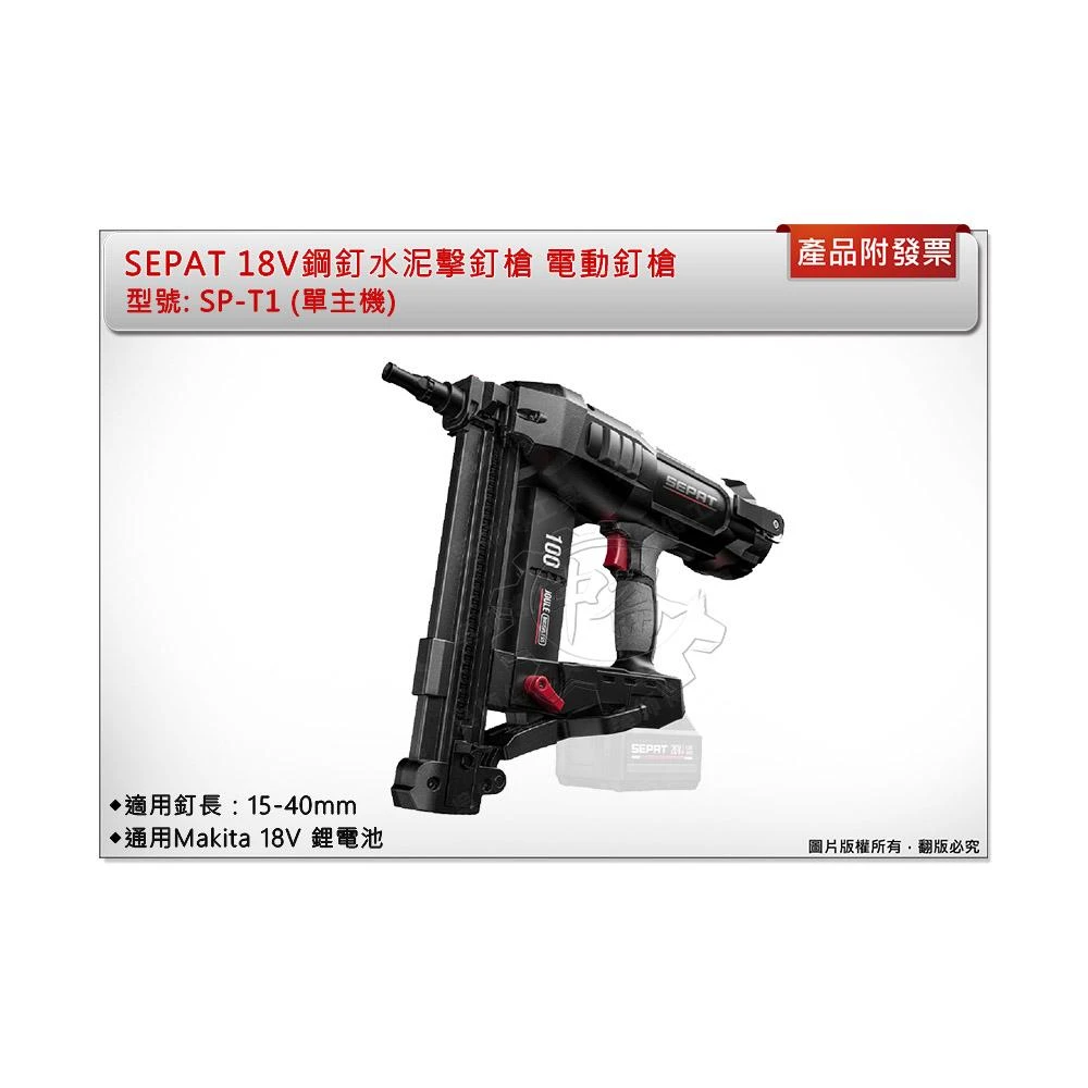 SEPAT 18V鋼釘水泥擊釘槍 SP-T1(單機+袋) 適用牧田18V電池 電動釘槍 送釘針1盒 中崙五金