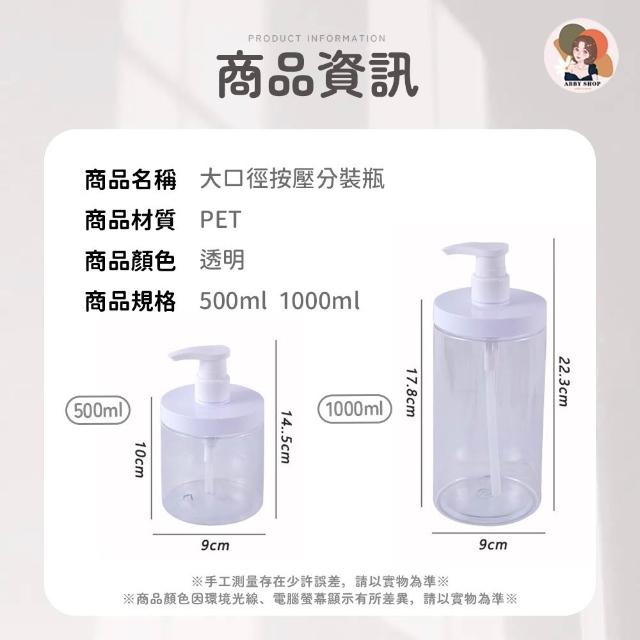 ABBY SHOP大口徑按壓分裝瓶 補充包分裝罐 (500ml 1000ml PET材質 免倒設計)