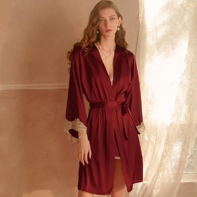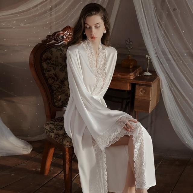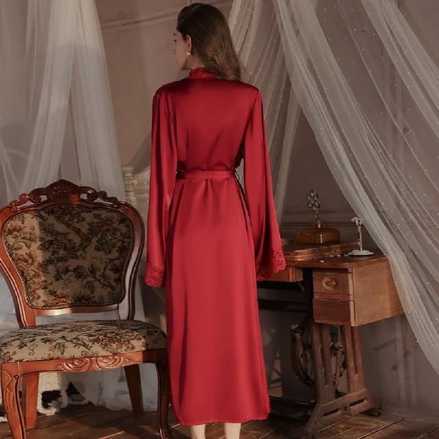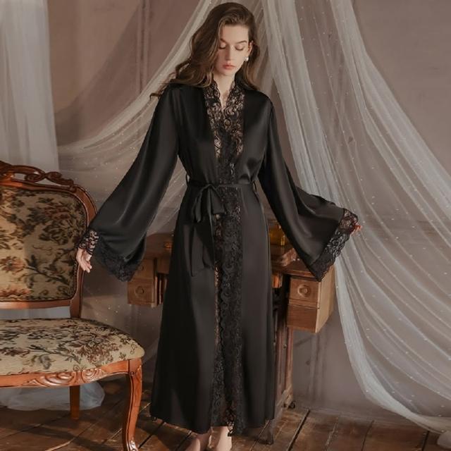 RoseMi 瑰覓大長袍絲滑緞面拼接透視蕾絲繫帶外袍SGX8898A 睡衣外袍 睡袍 大尺碼睡衣 性感睡衣