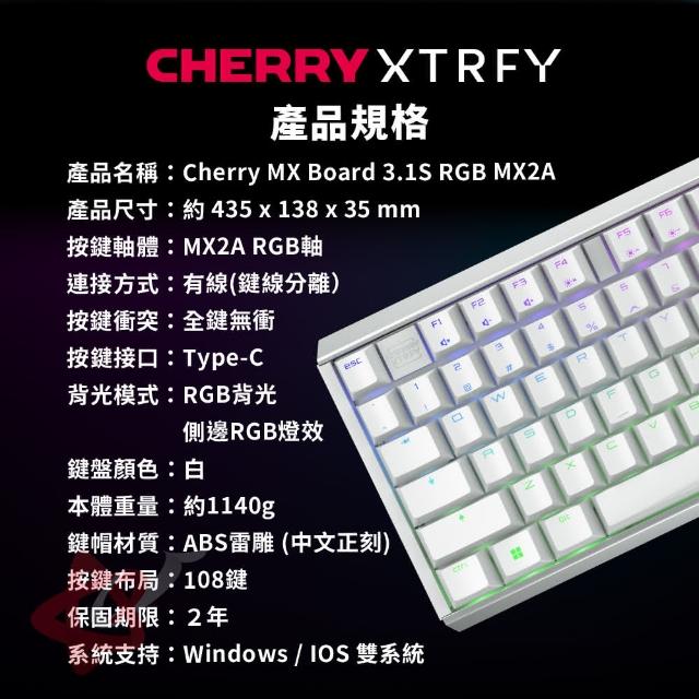 CherryMX 3.1S RGB MX2A 粉色/白色/黑正刻 茶軸/靜音紅軸 機械鍵盤超商限寄一隻