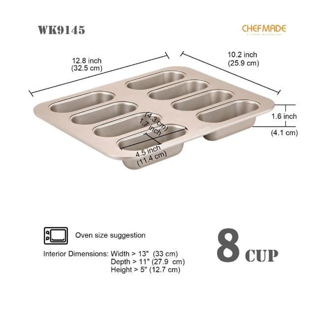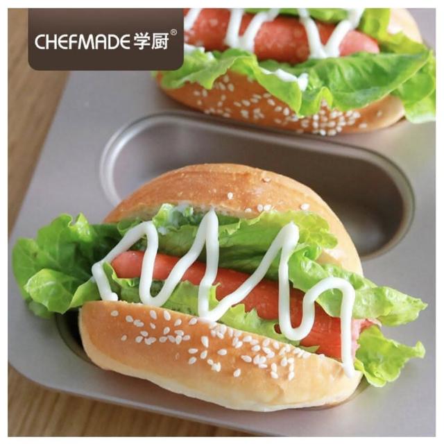 Chefmade 學廚宇宙工作室 原廠正品 8連不粘橢圓長條麵包模(WK9145金色8連橢圓麵包模小漢堡模長條麵包模蛋糕模麵包烤盤)