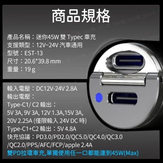 E Store迷你45W車用充電器 汽車車充 雙Type-C PD USB 車充 快充
