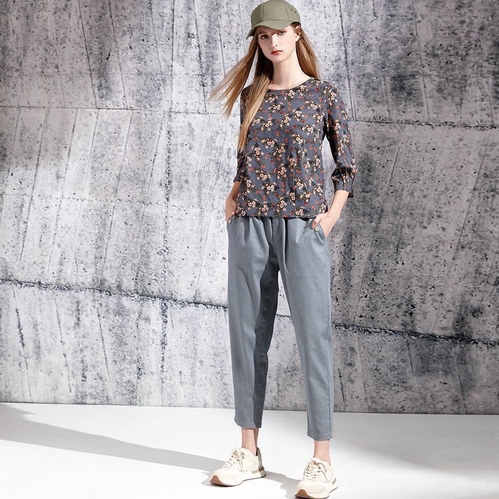 JIN HWA 今譁復古可愛小碎花袖口小立摺造型修身上衣V6051