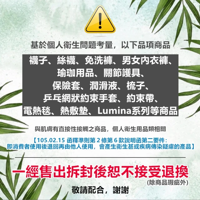 - 個人衛生用品除商品本身有瑕疵外,未拆封商品仍享有十天猶豫期之退貨權利。但已拆封 (如剪標、下水等情形…),依據《通訊交易解除權合理例外情事適用準則》第二條規定,商店無法接受退換貨。
