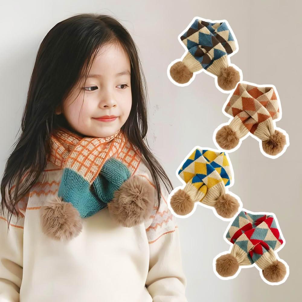 《粉紅桃子》兒童毛球造型圍巾|兒童圍巾 加厚加暖 可愛針織圍脖 交叉棋盤格 毛球圍巾 寶寶嬰兒圍巾