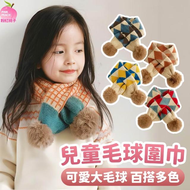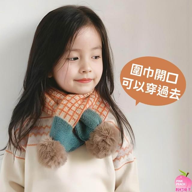 《粉紅桃子》兒童毛球造型圍巾|兒童圍巾 加厚加暖 可愛針織圍脖 交叉棋盤格 毛球圍巾 寶寶嬰兒圍巾
