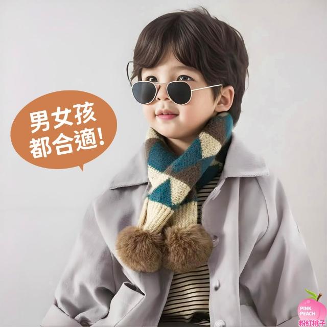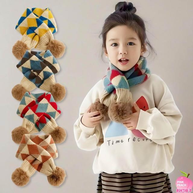 《粉紅桃子》兒童毛球造型圍巾|兒童圍巾 加厚加暖 可愛針織圍脖 交叉棋盤格 毛球圍巾 寶寶嬰兒圍巾