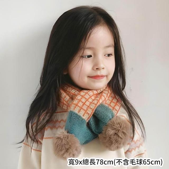 《粉紅桃子》兒童毛球造型圍巾|兒童圍巾 加厚加暖 可愛針織圍脖 交叉棋盤格 毛球圍巾 寶寶嬰兒圍巾