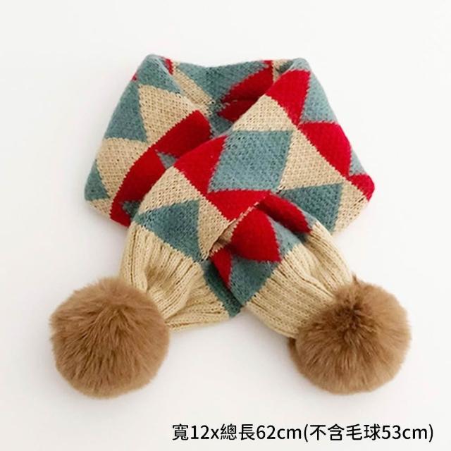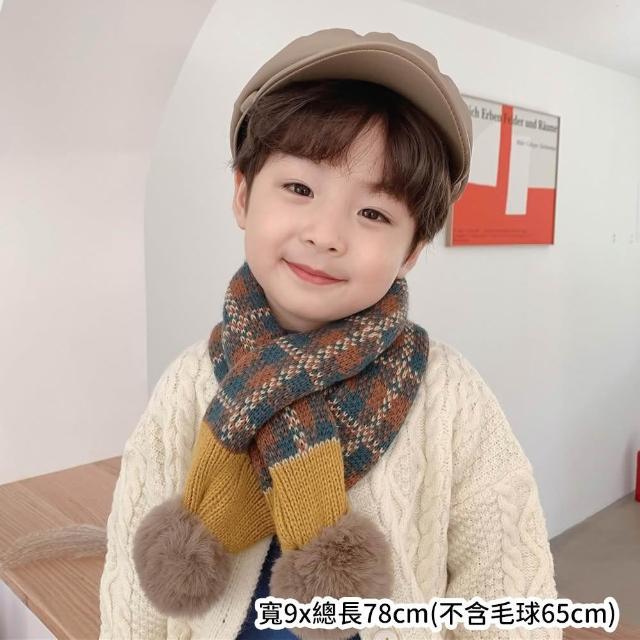 《粉紅桃子》兒童毛球造型圍巾|兒童圍巾 加厚加暖 可愛針織圍脖 交叉棋盤格 毛球圍巾 寶寶嬰兒圍巾