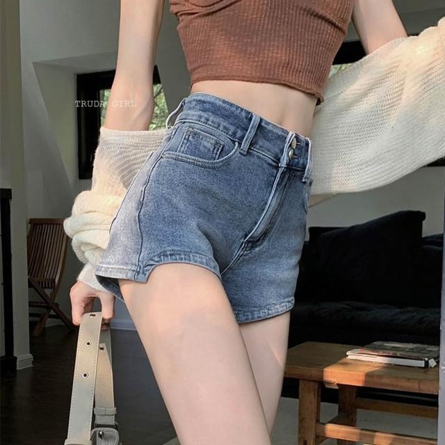 《杜達女孩》XS-XL四色逆天長腿牛仔短褲 前短後長 熱褲 超彈力短褲 牛仔短褲 顯瘦短褲 兩扣高腰牛仔短褲 短褲 女