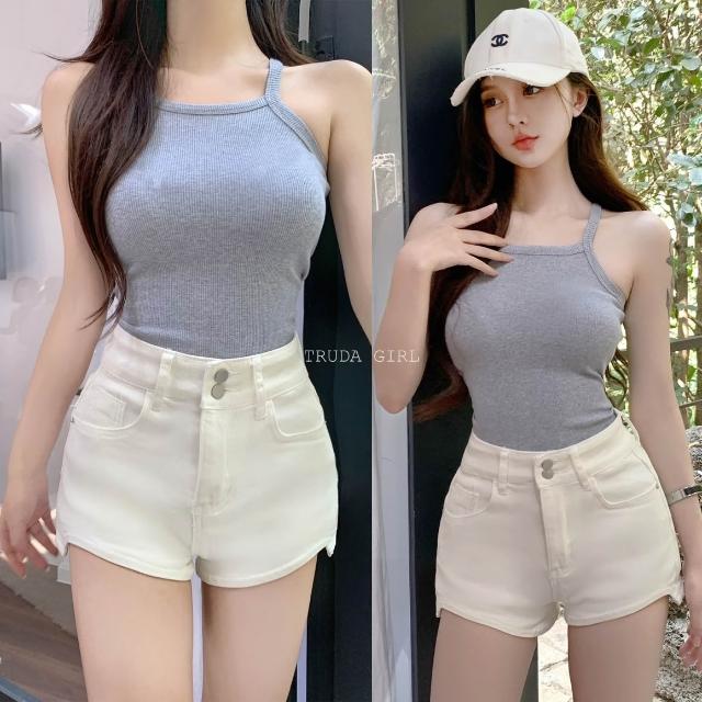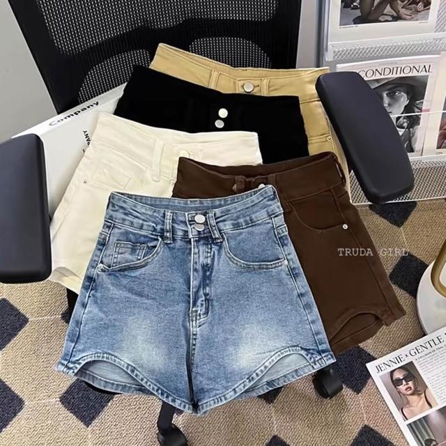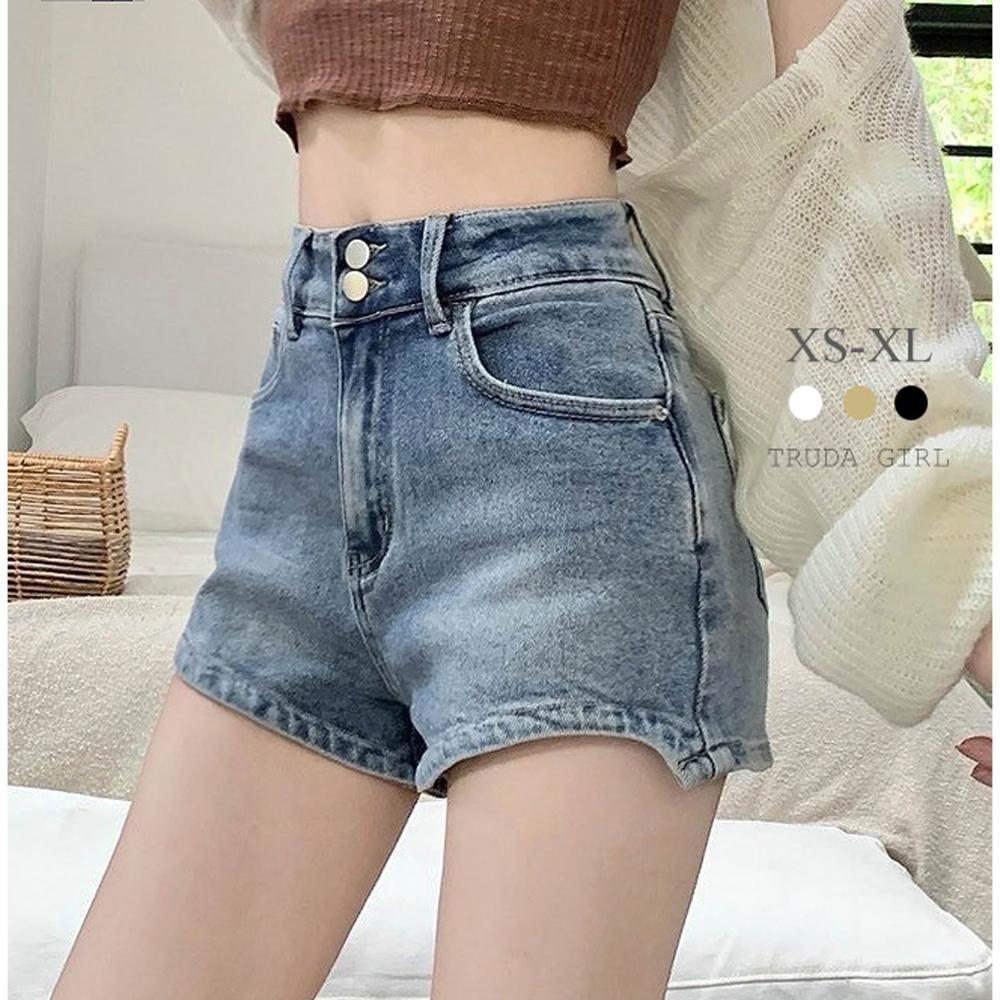 《杜達女孩》XS-XL四色逆天長腿牛仔短褲 前短後長 熱褲 超彈力短褲 牛仔短褲 顯瘦短褲 兩扣高腰牛仔短褲 短褲 女