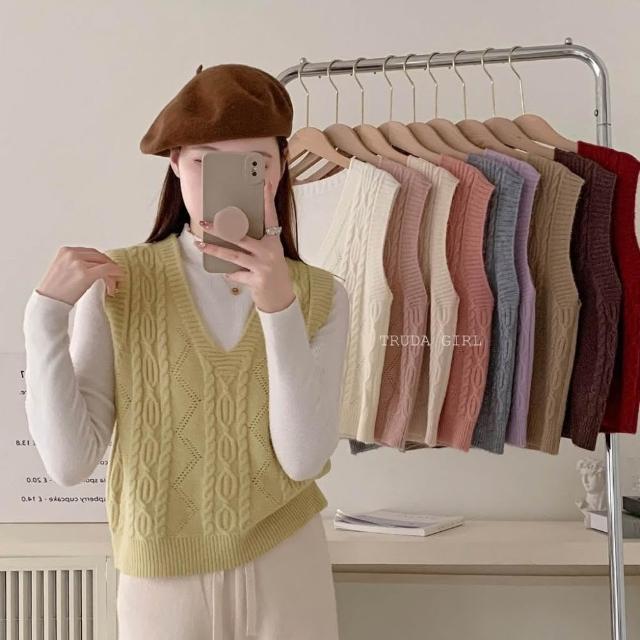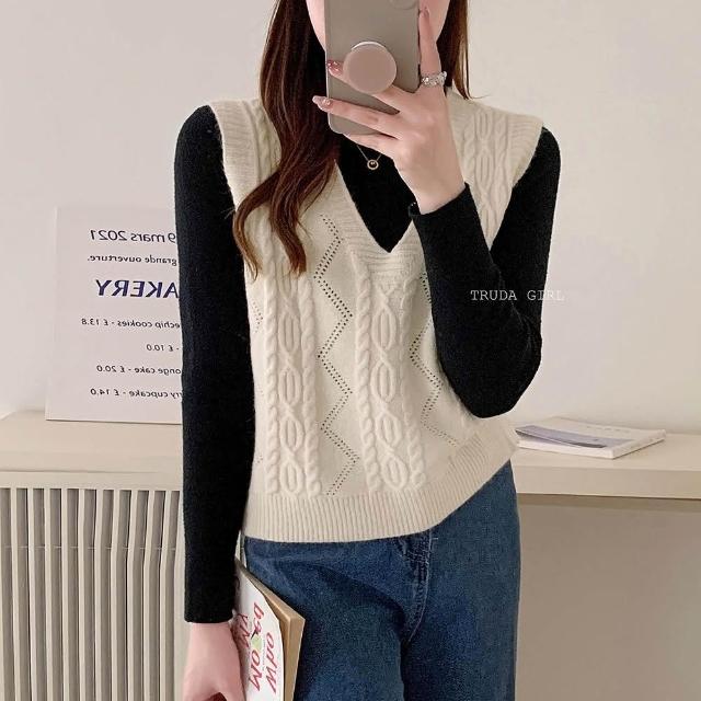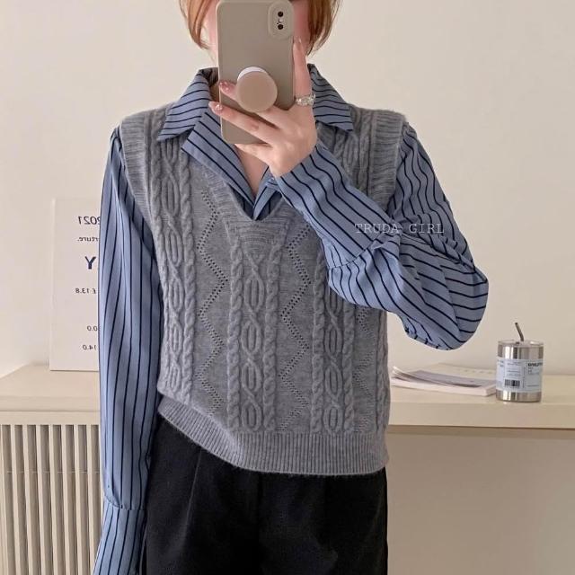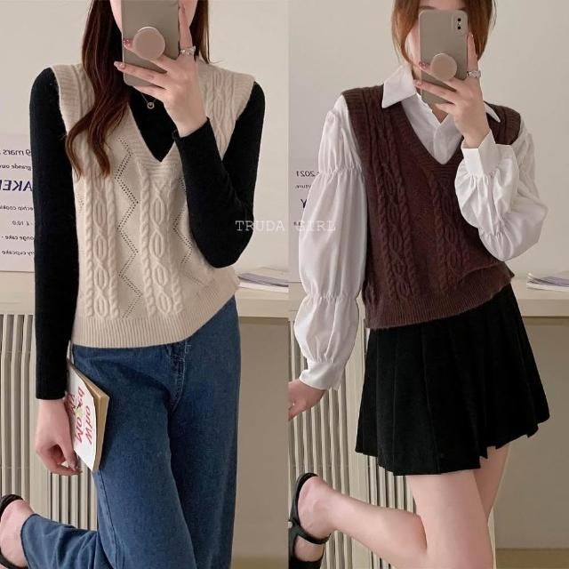 《杜達女孩》疊穿麻花辮馬甲背心 學院風仿羊絨混紡馬甲背心 毛衣背心 麻花背心 秋冬背心 外搭背心 V領背心搭襯衫 包芯紗
