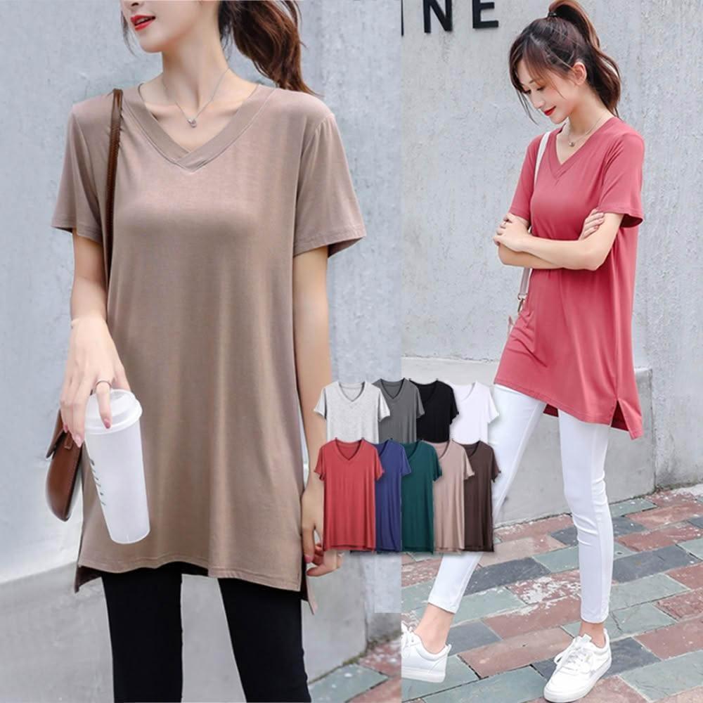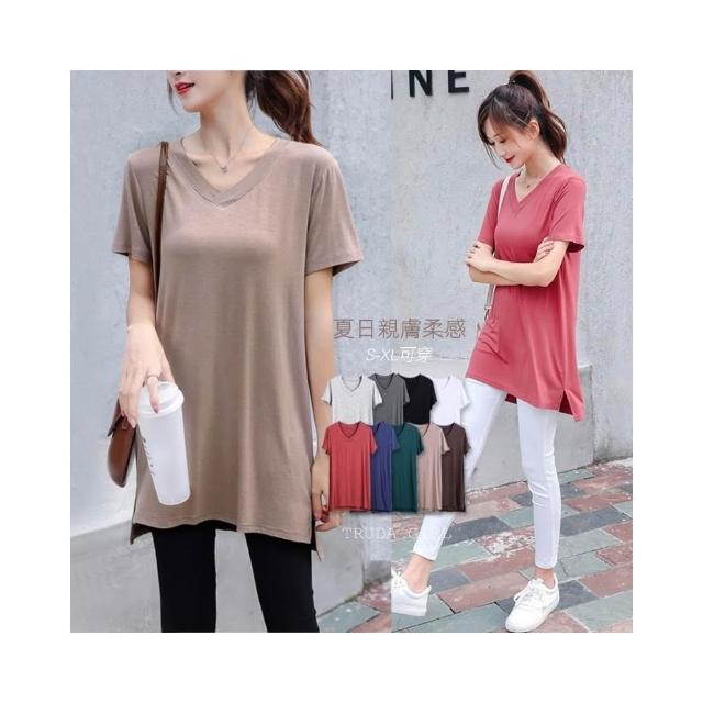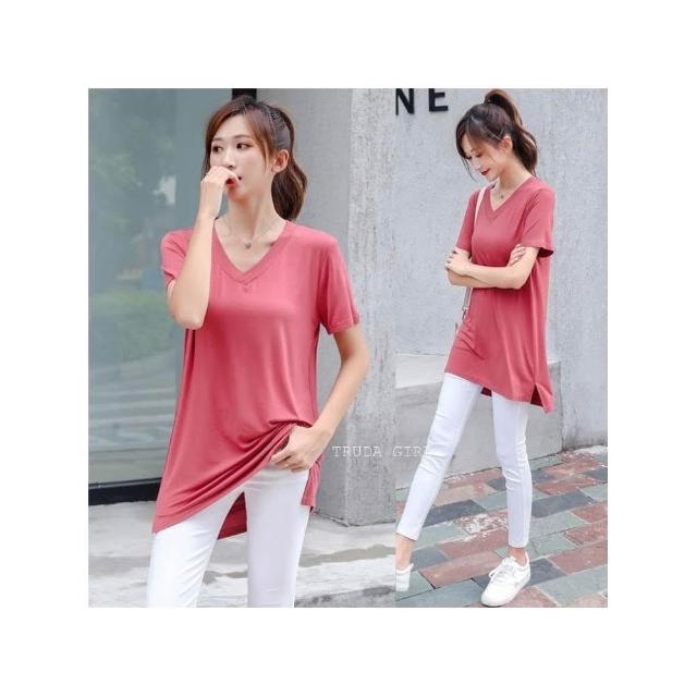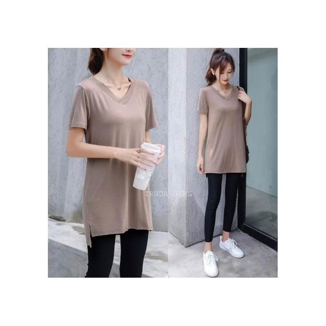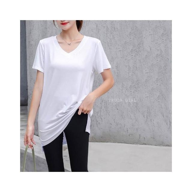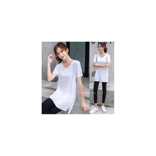 《杜達女孩》無負擔莫代爾涼感短袖中長版T V領短袖上衣 長版上衣 短袖長版T 開叉T 長版 涼感上衣 短袖T恤