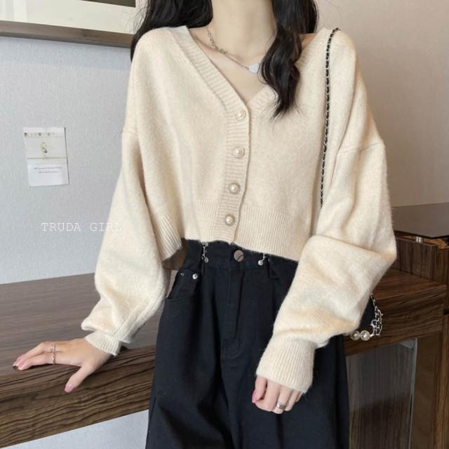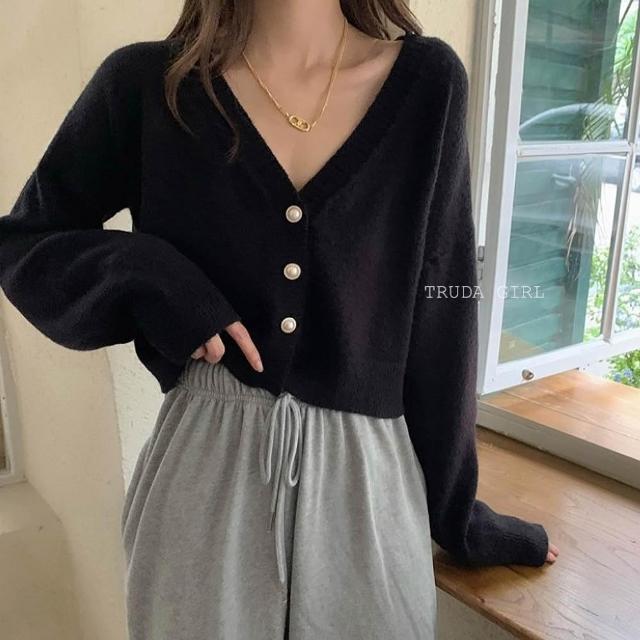 《杜達女孩》輕奢仿羊絨混紡珍珠釦短版針織外套 V領針織毛衣 短版針織外套 排釦毛衣 開襟外套 短版毛衣 長袖毛衣