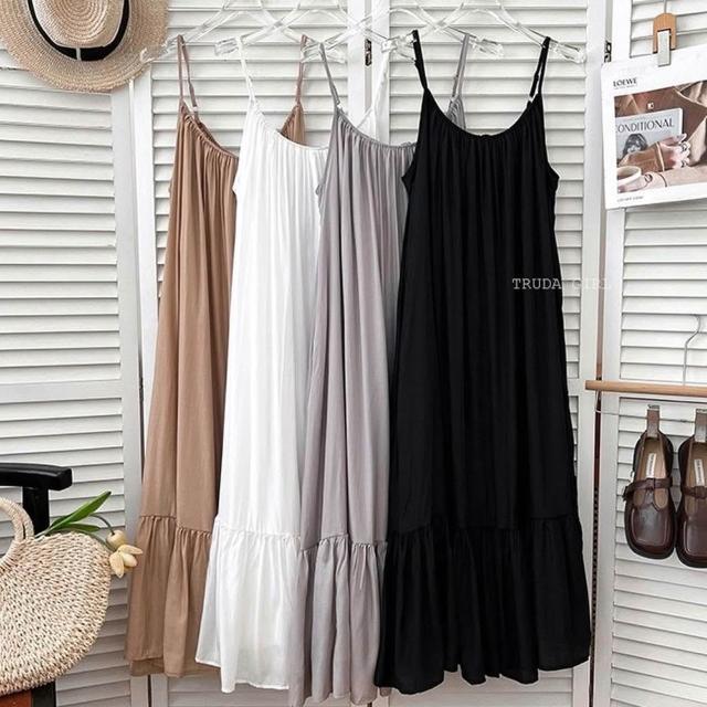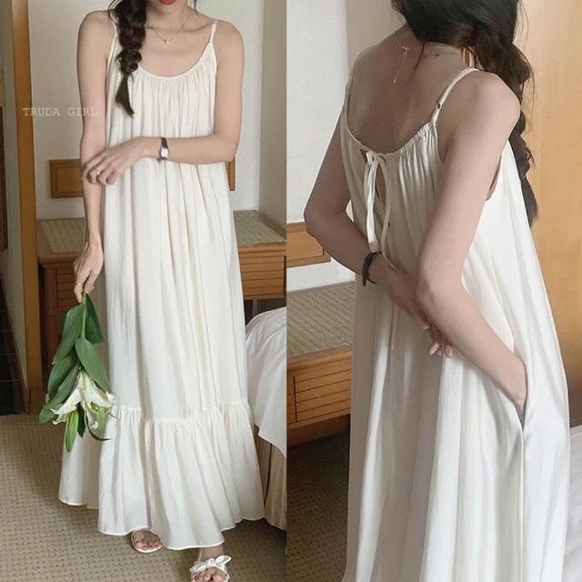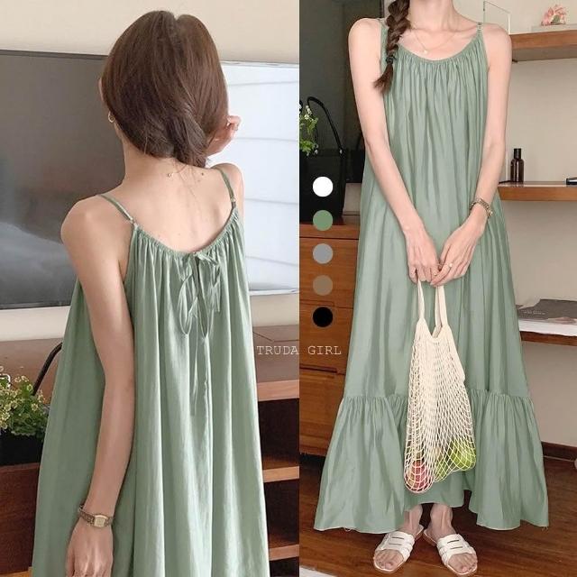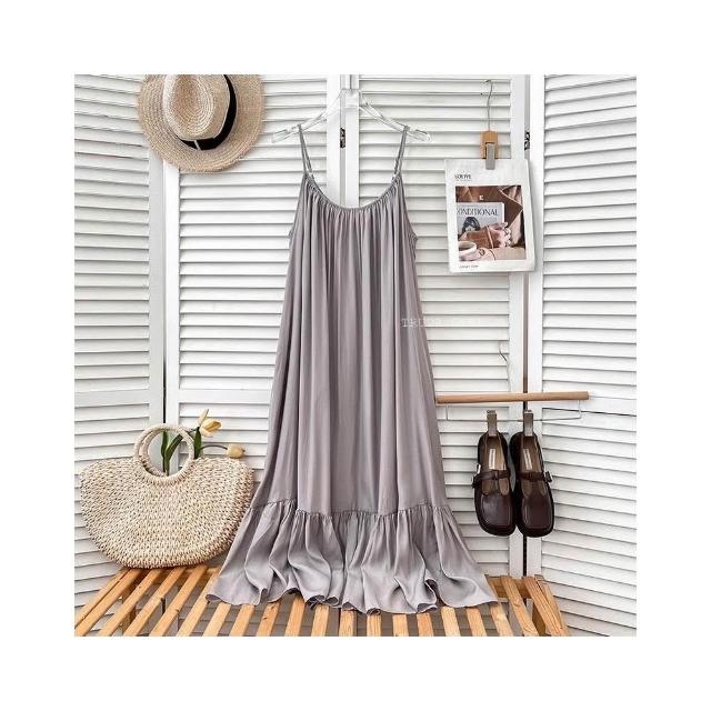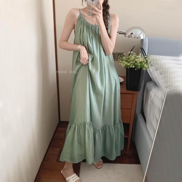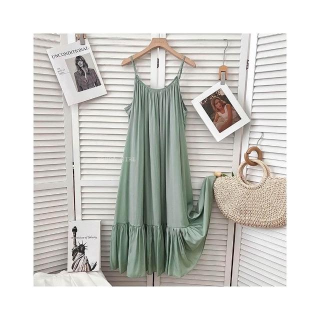 《杜達女孩》薄荷色的溫柔 仿天絲珠光棉洋裝 吊帶裙 吊帶長裙 吊帶洋裝 海邊度假風 連身裙 連身洋裝 雪紡洋裝 白色洋裝
