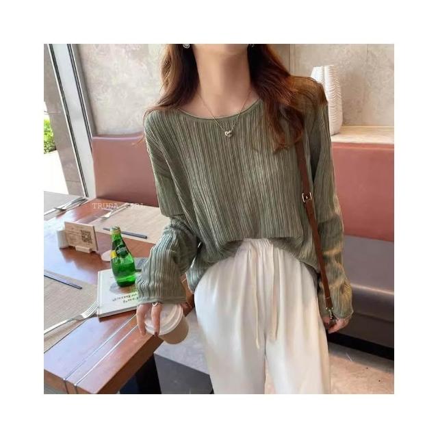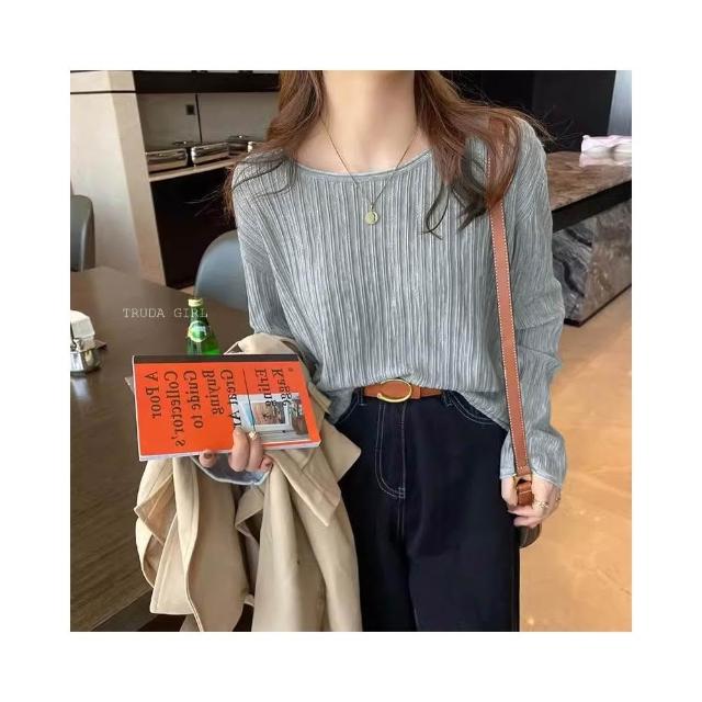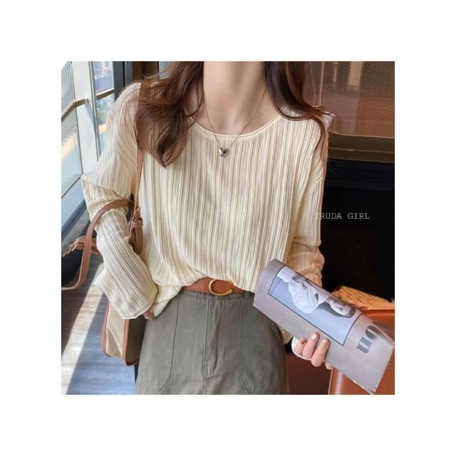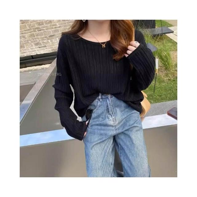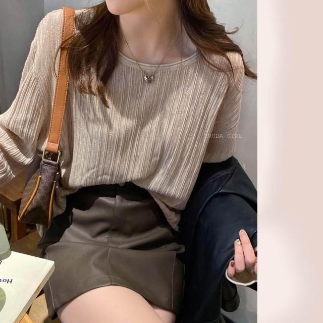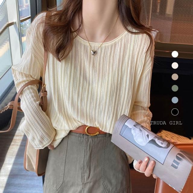 《杜達女孩》質感肌理紋坑條上衣 圓領針織上衣 圓領針織衫 長袖針織上衣 安迪絨針織 包芯紗長袖上衣 捲邊上衣 薄長袖 女