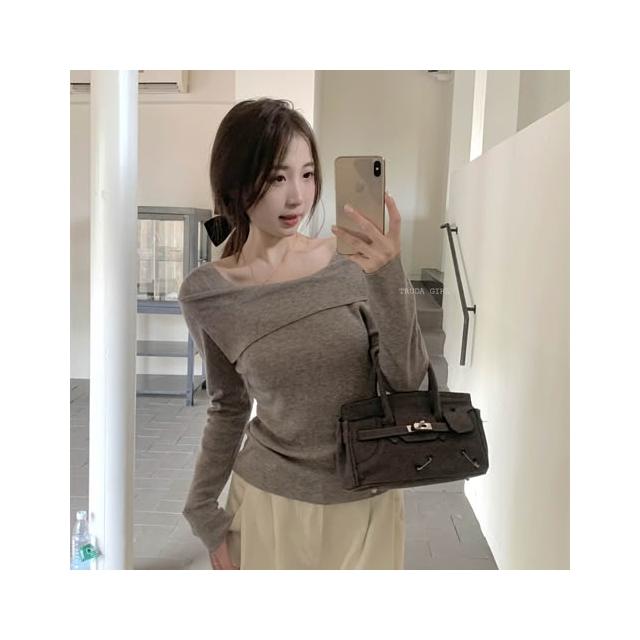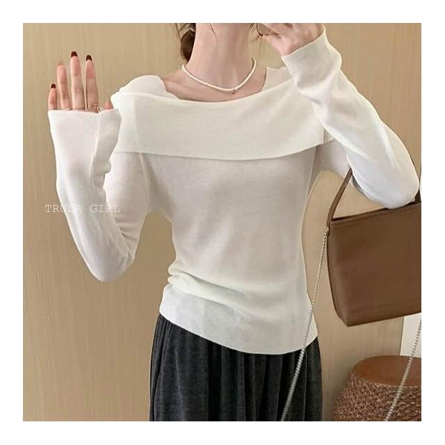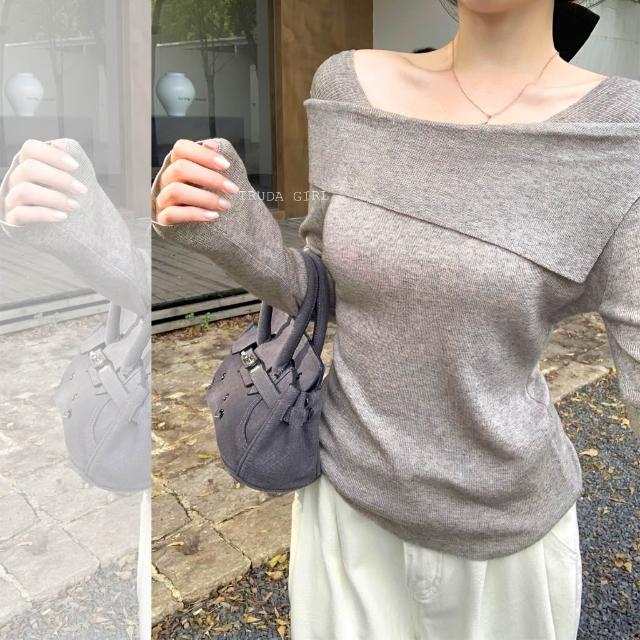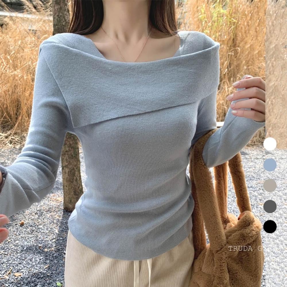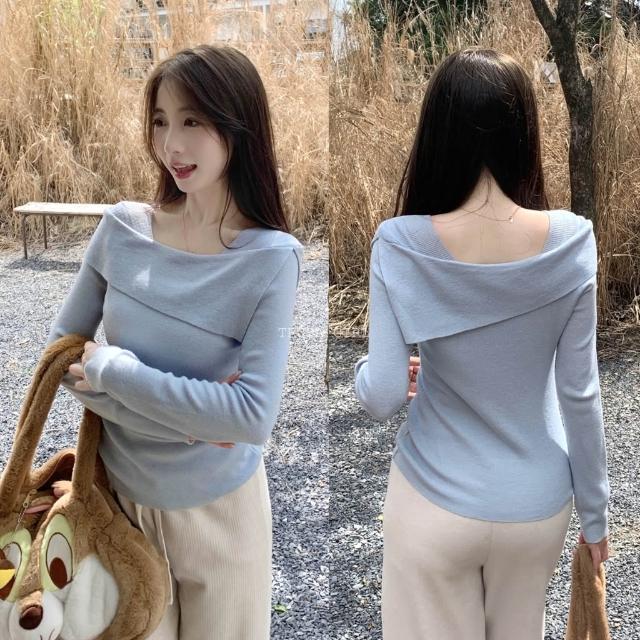 《杜達女孩》柯德莉藍 造型翻領假一字領針織上衣 包芯紗一字領上衣 長袖上衣 薄針織 薄毛衣 針織上衣 長袖針織 造型長袖