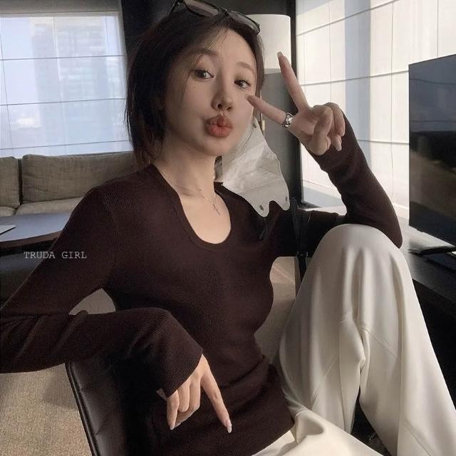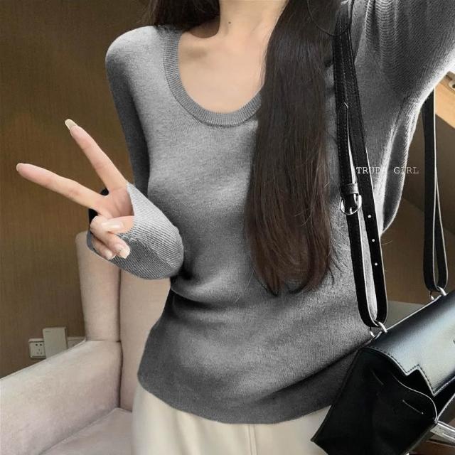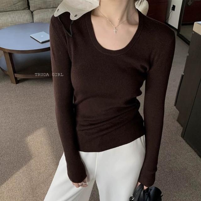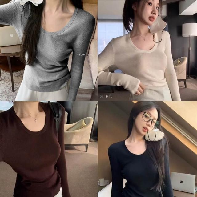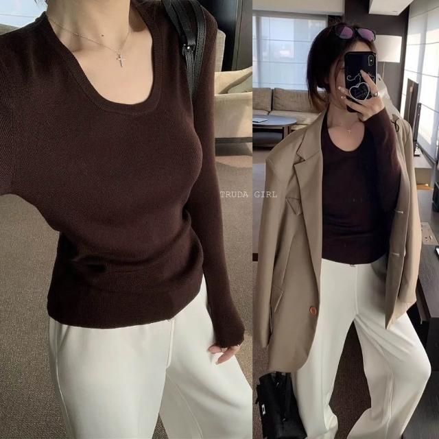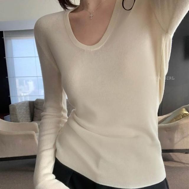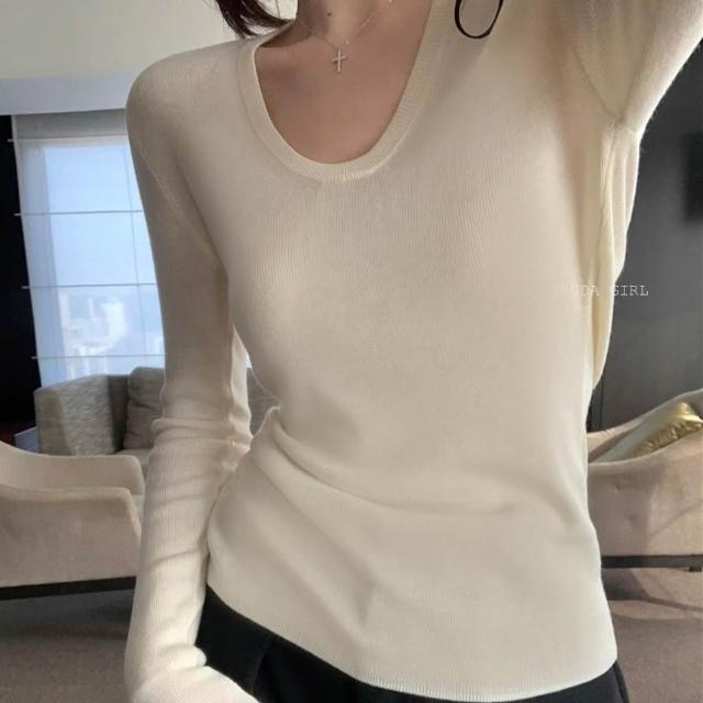 《杜達女孩》加厚細織包邊大U領針織衫 內搭外穿打底針織上衣 V領上衣 長袖針織 包芯紗長袖上衣 薄針織 女 薄長袖 上衣