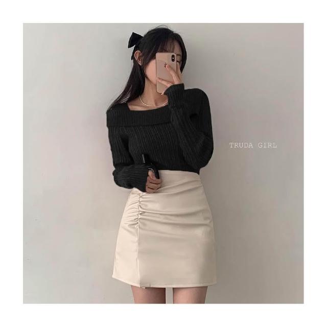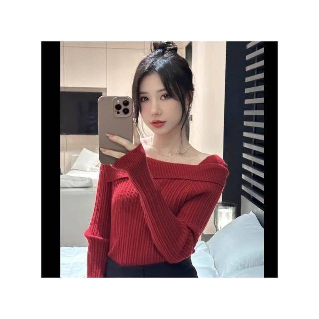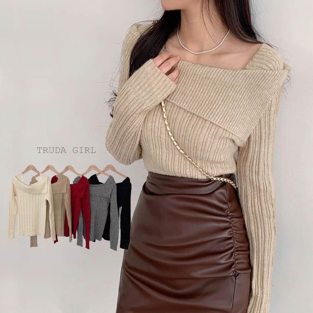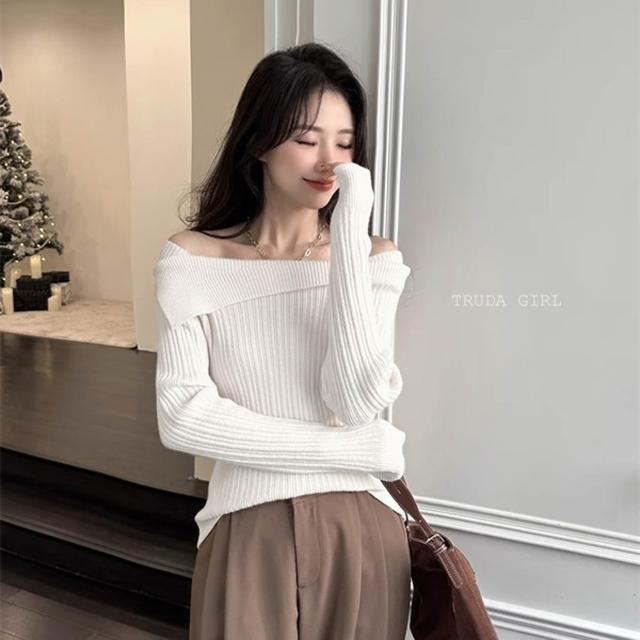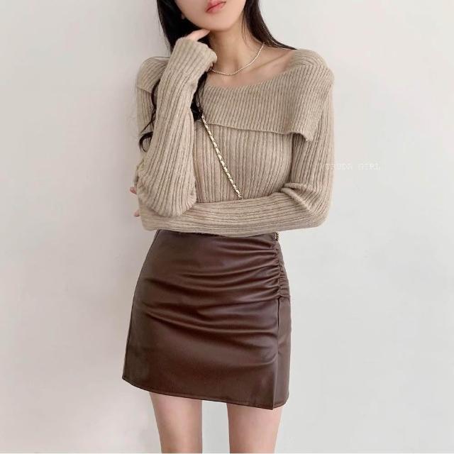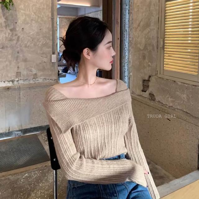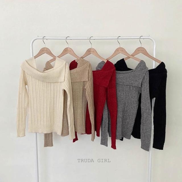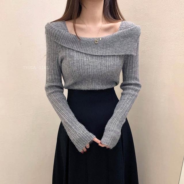 《杜達女孩》戀愛氛圍 造型翻領假一字領針織上衣 包心紗一字領上衣 長袖上衣 薄針織 薄毛衣 坑條針織上衣 長袖針織 女