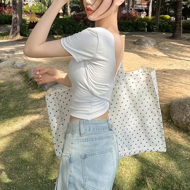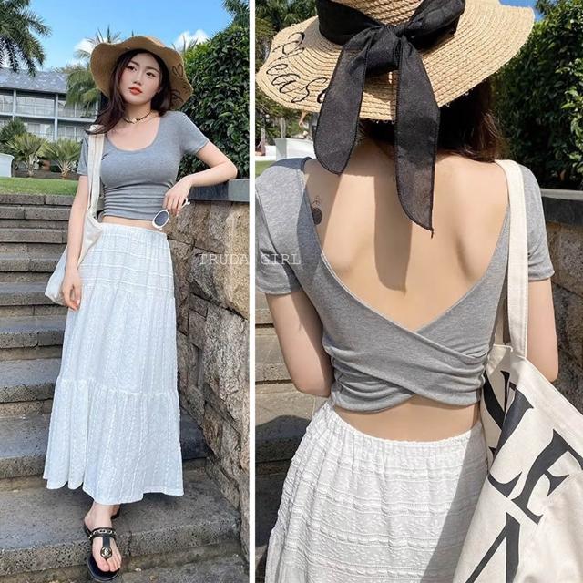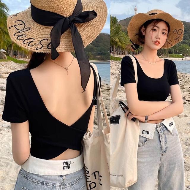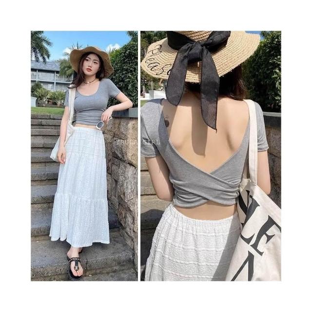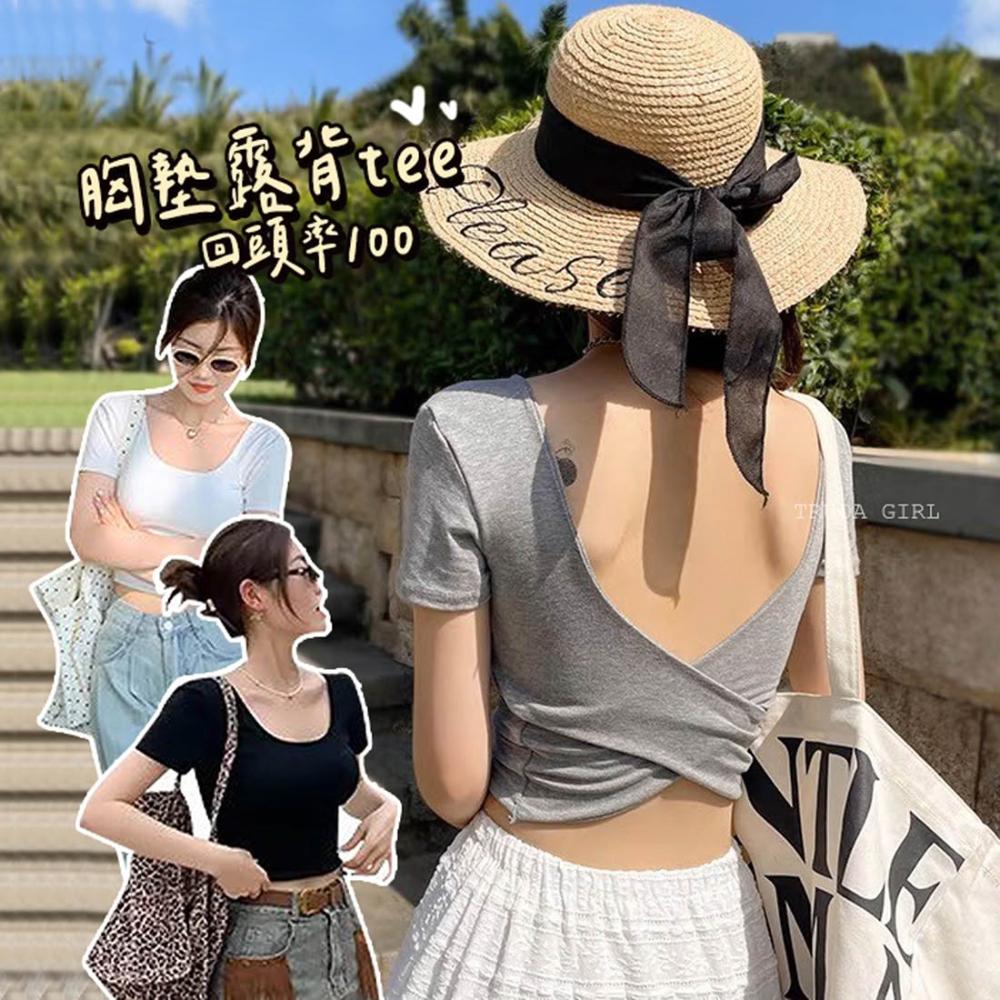 《杜達女孩》心動crush 胸墊交叉露背短袖tee 短袖上衣 美背式上衣 胸墊上衣 小可愛上衣 U領上衣 棉質上衣 度假