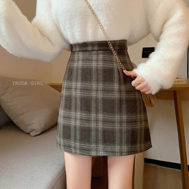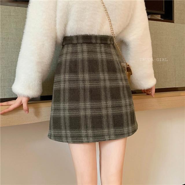 《杜達女孩》復古毛呢格紋短裙 防走光格紋高腰短裙 格子裙 格子毛呢短裙 包臀裙 窄裙 裙子 a字裙 呢子短裙 秋冬短裙