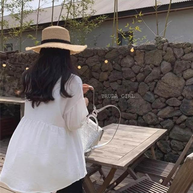 《杜達女孩》海鹽氧氣仿麻雪紡上衣 V領七分袖娃娃裝 傘狀上衣 遮肚上衣 寬鬆上衣 娃娃裝 孕婦裝 雪紡上衣 V領上衣 女