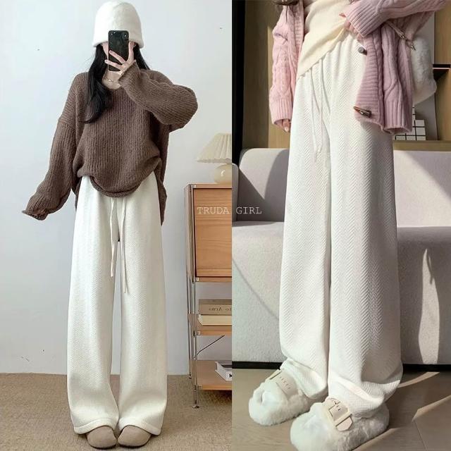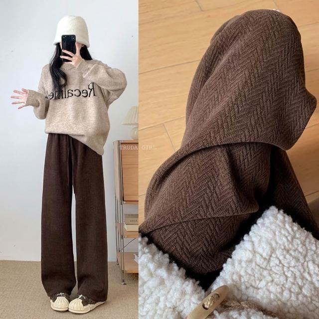 《杜達女孩》店長推薦人字紋雪尼爾寬褲 加長加絨款 顯瘦闊腿褲 寬褲 秋冬保暖長褲 加絨長褲 刷毛長褲 女 褲子 長褲