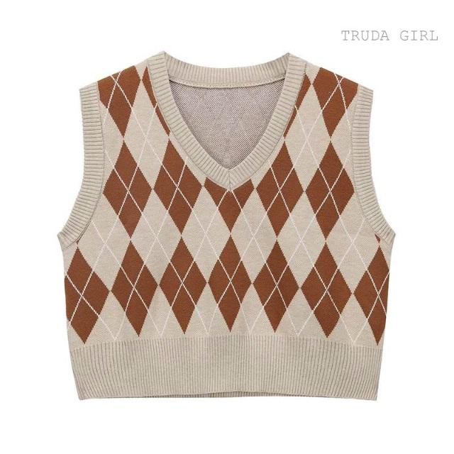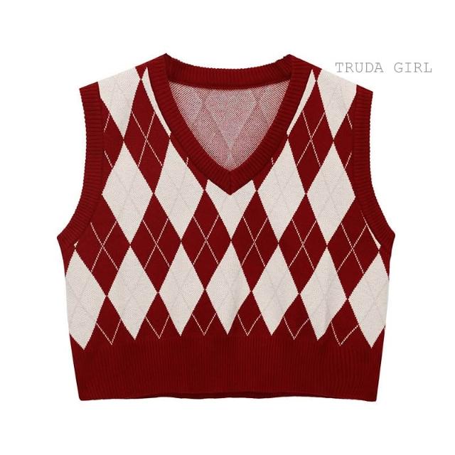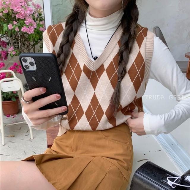 《杜達女孩》妹仔首選 菱格紋針織馬甲背心 V領背心 馬甲背心 毛衣背心 針織背心 外搭背心 寬鬆針織背心 學院風毛衣背心