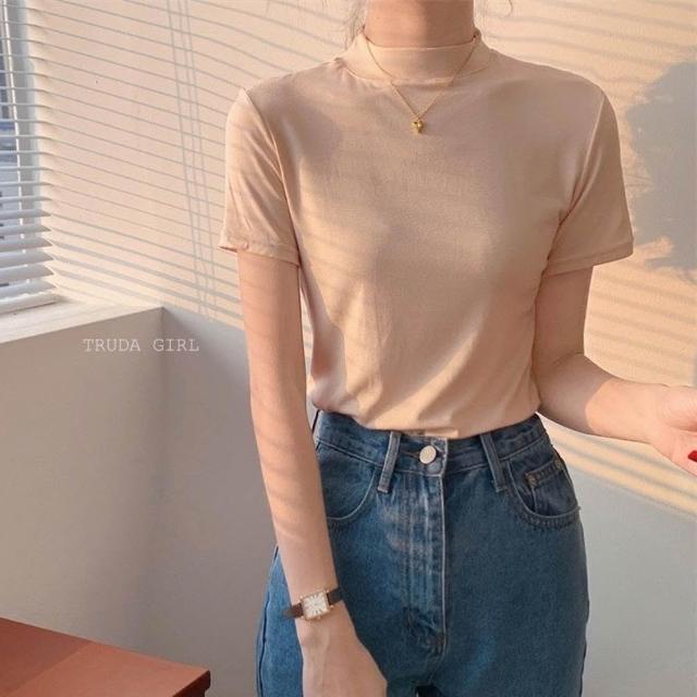 《杜達女孩》裸感老闆娘小立領 面膜半高領 極細螺紋棉 半高領短袖上衣 短袖t恤 涼感莫代爾 高彈力 四季可穿 半高領上衣
