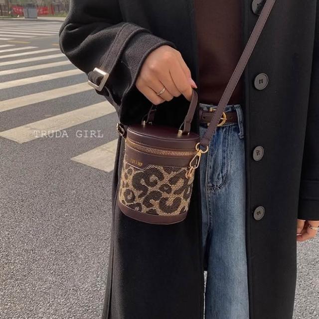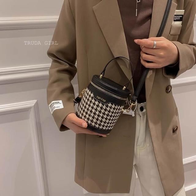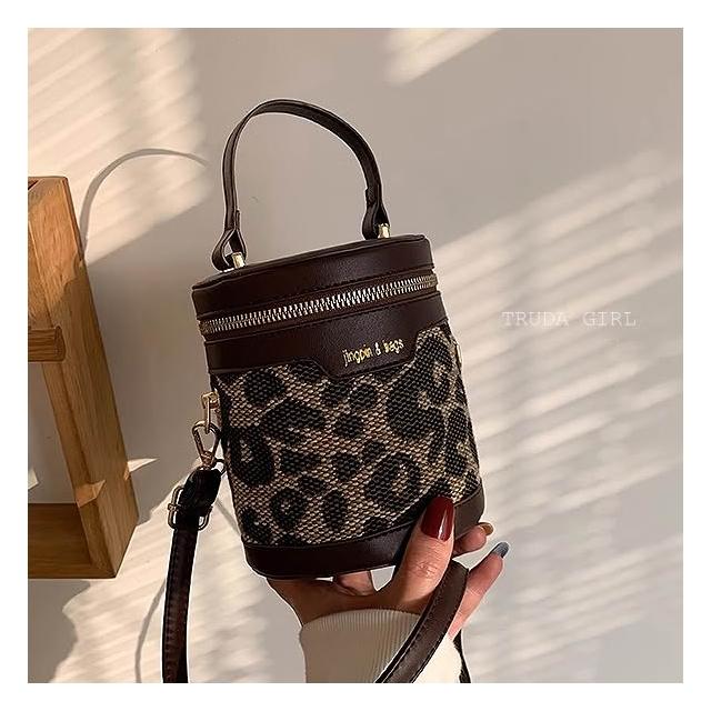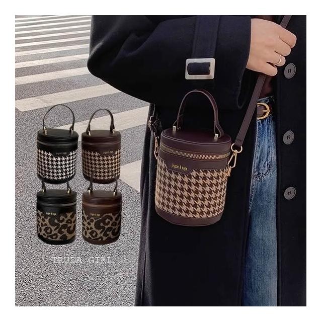 《杜達女孩》秋冬感千鳥格/豹紋毛呢水桶包 側背包 肩背包 女包 小包包 水桶包 手提包 小圓包 格紋小包 圓筒包 包包