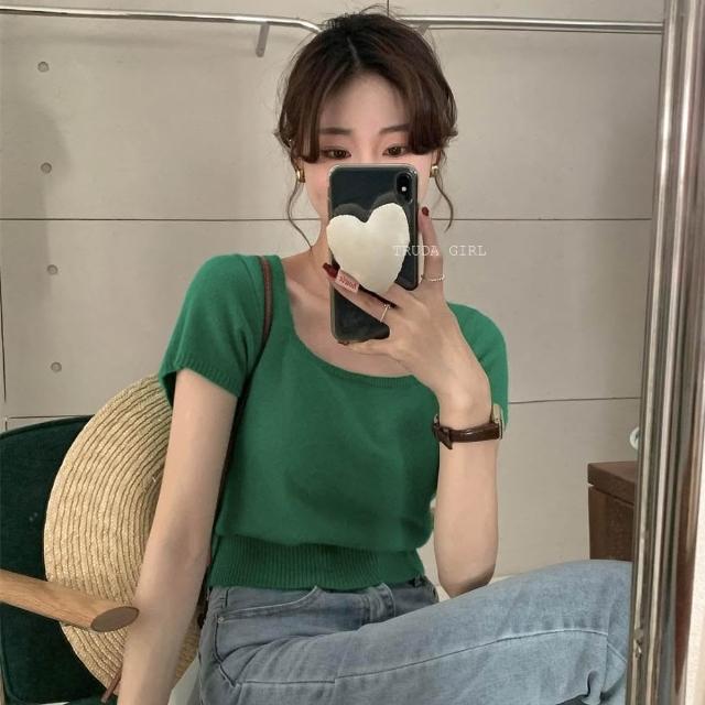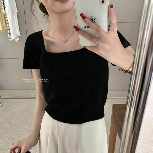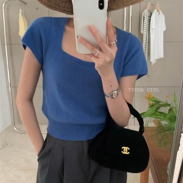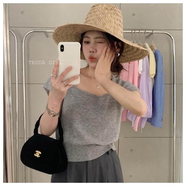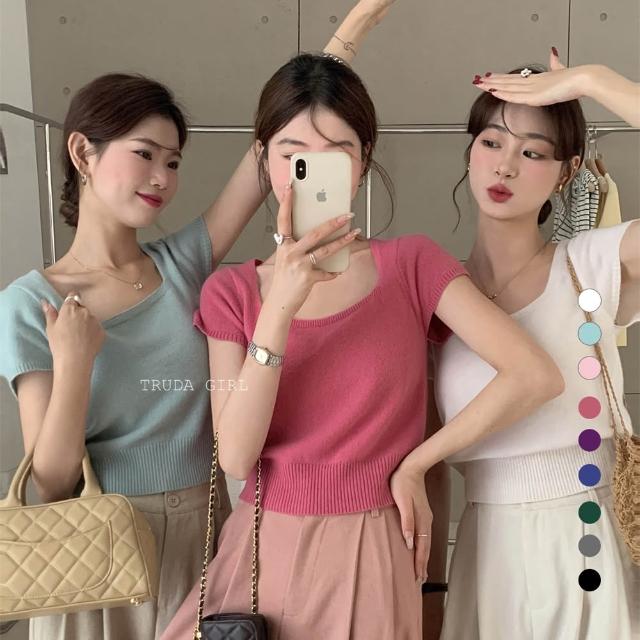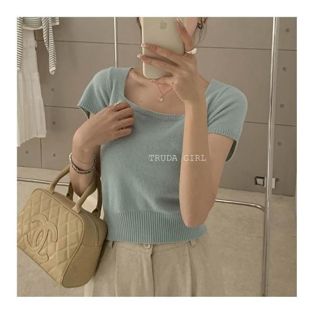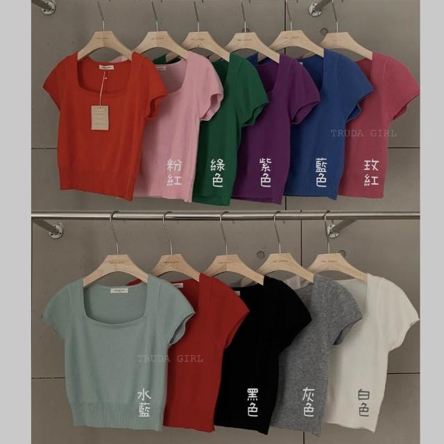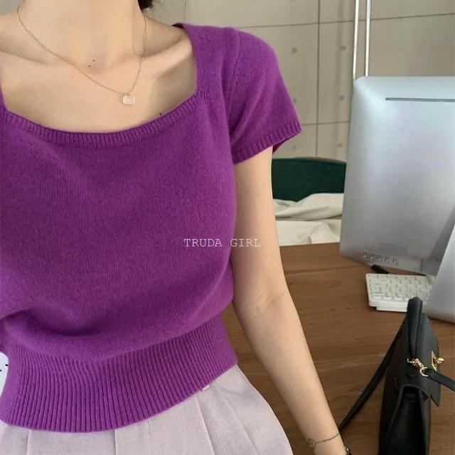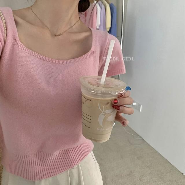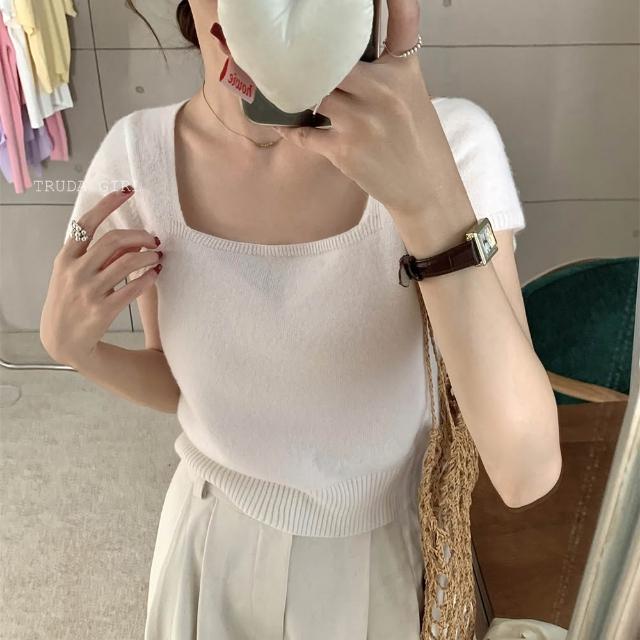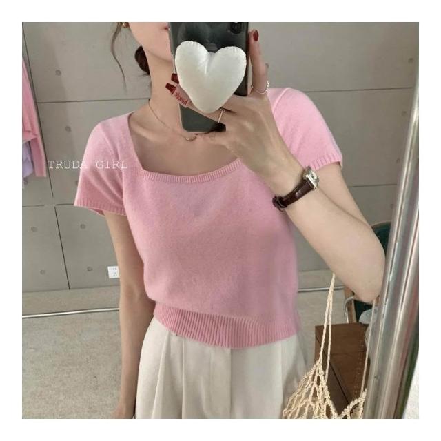 《杜達女孩》方領雲朵針織小衫 針織上衣 超優質包心紗方領上衣 短袖上衣 針織上衣 短袖針織上衣 女 氣質上衣 薄針織短袖
