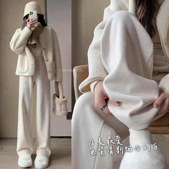 《杜達女孩》2025新款軟糯坑條糯米褲 秋冬寬褲 加厚加絨褲 棉質休閒褲 保暖褲 針織褲 拖地褲 闊腿褲 長褲 女 褲子