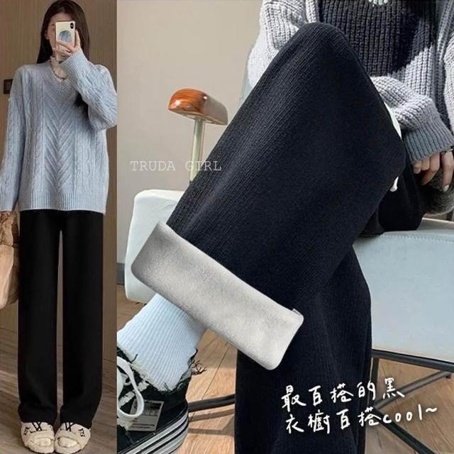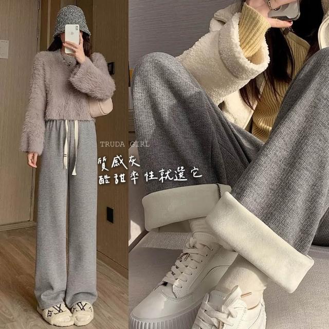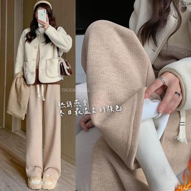 《杜達女孩》2025新款軟糯坑條糯米褲 秋冬寬褲 加厚加絨褲 棉質休閒褲 保暖褲 針織褲 拖地褲 闊腿褲 長褲 女 褲子
