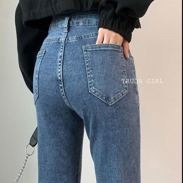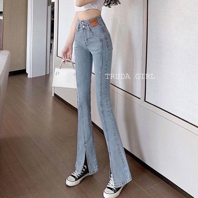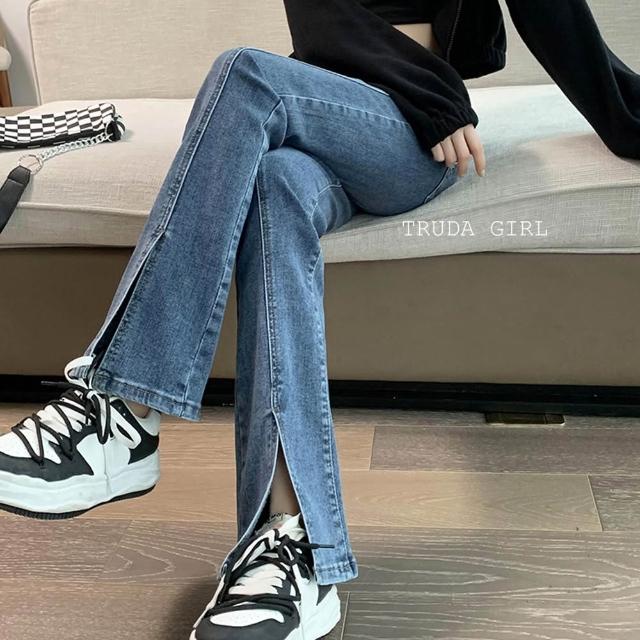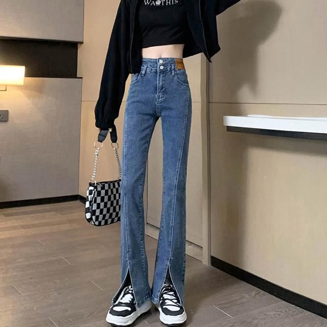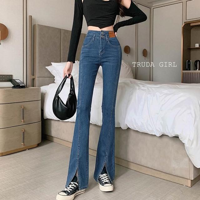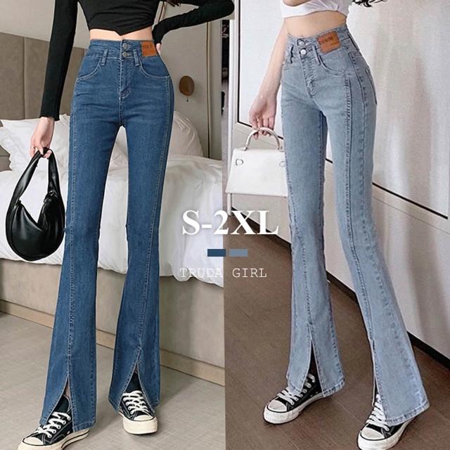 《杜達女孩》瘦巴巴皮標喇叭褲 S-2XL高腰排扣微喇叭開叉牛仔長褲 高腰牛仔長褲 開叉牛仔褲 喇叭褲 牛仔褲 長褲 褲子