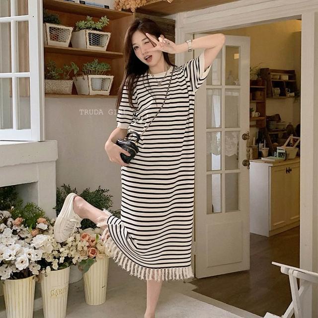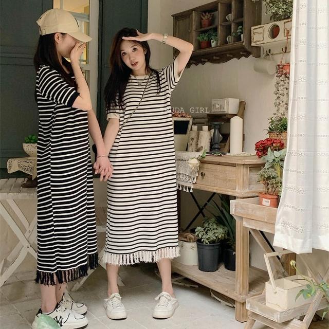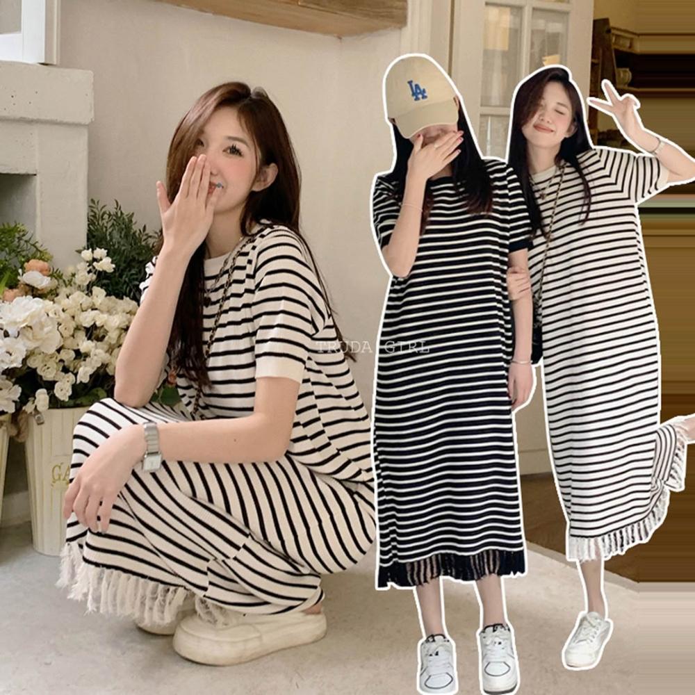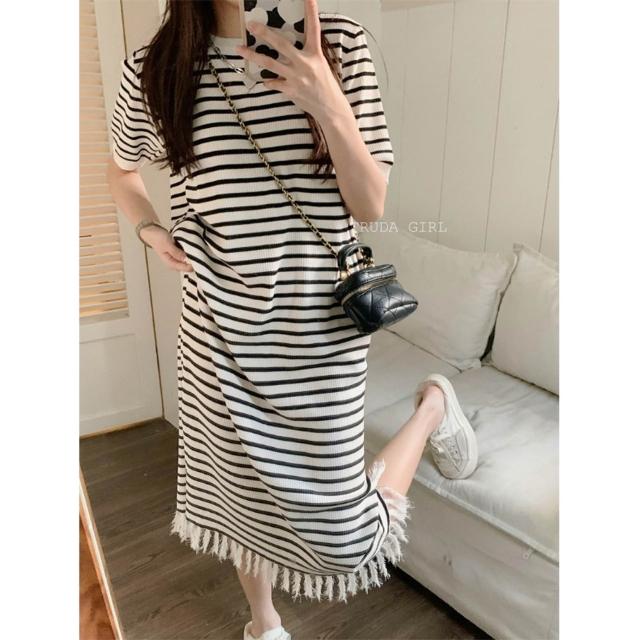 《杜達女孩》舒適度跟顏值都討喜的美衣 氣質條紋連身裙 連身洋裝 短袖洋裝 冰絲針織長版上衣 連身裙 休閒長版上衣 針織裙