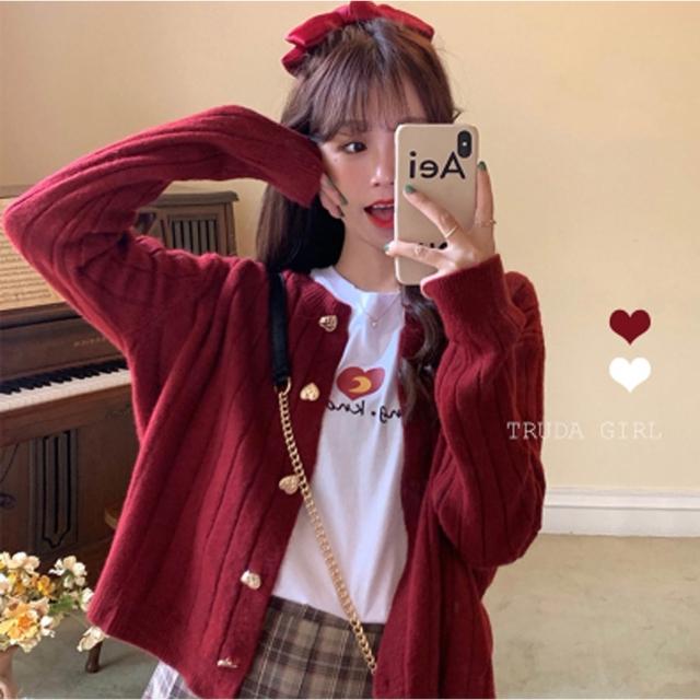 《杜達女孩》甜美愛心排釦坑條混仿羊絨針織毛衣 心型釦 針織外套 包心紗針織 針織衫 毛衣外套 長袖上衣 長袖毛衣